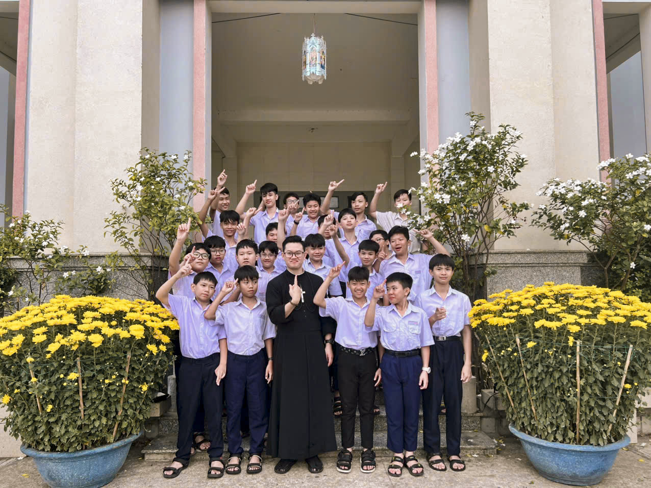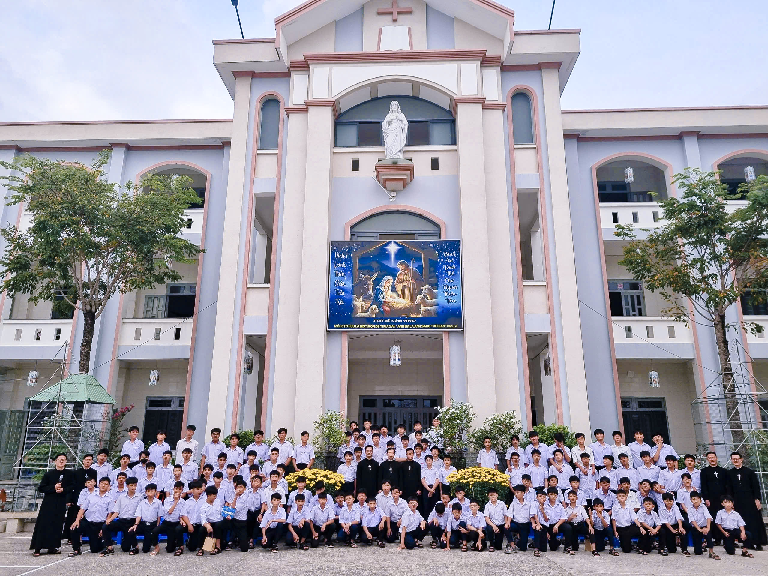 Thánh lễ tạ ơn và tất niên được cử hành vào lúc 5h15, sáng ngày 7 tháng 2 năm 2026 do Cha Giuse Đặng Văn Cấp – Giám đốc Nhà Lưu trú – chủ tế và giảng lễ, cùng với sự hiện diện của quý Thầy đồng hành và 115 em lưu trú sinh. “Chúng ta đang hiện diện trong Thánh lễ Tất Niên – thời khắc khép lại một năm cũ để chuẩn bị bước sang năm mới. Đây không chỉ là lúc cộng sổ những việc đã làm, mà còn là lúc dừng lại, lắng nghe, và ở lại với Chúa. Dừng lại giữa một thế giới quay cuồng. Lắng nghe giữa vô vàn âm thanh. Và ở lại với Chúa giữa bao bận rộn của đời sống. Lời Chúa hôm nay vang lên thật dịu dàng nhưng rất mạnh mẽ: “Anh em hãy lánh riêng ra một nơi thanh vắng mà nghỉ ngơi đôi chút.” (Mc 6,31)”, đó là những lời mà Cha chủ tế mời gọi cộng đoàn trong thánh lễ tất niên đặc biệt này.