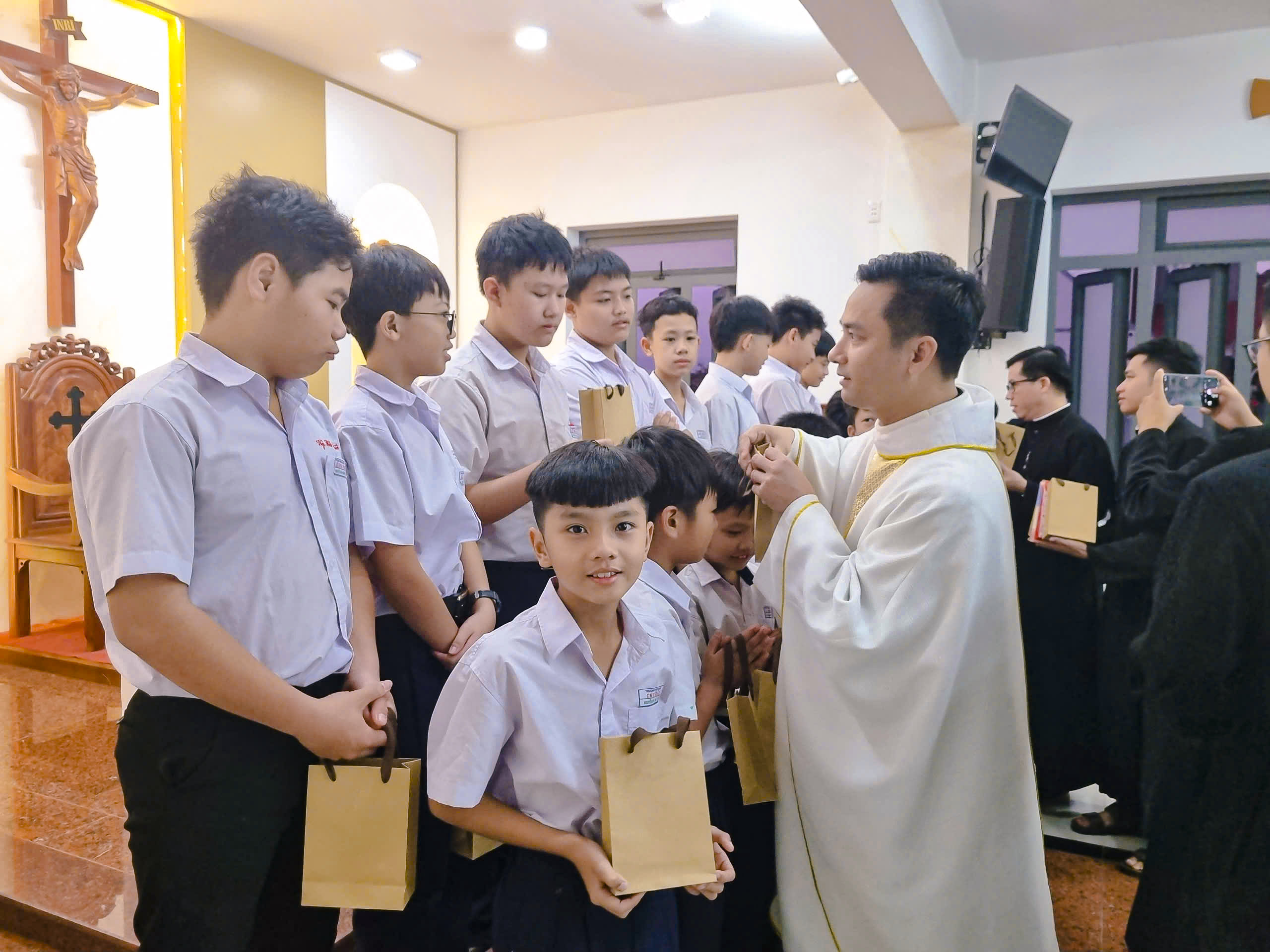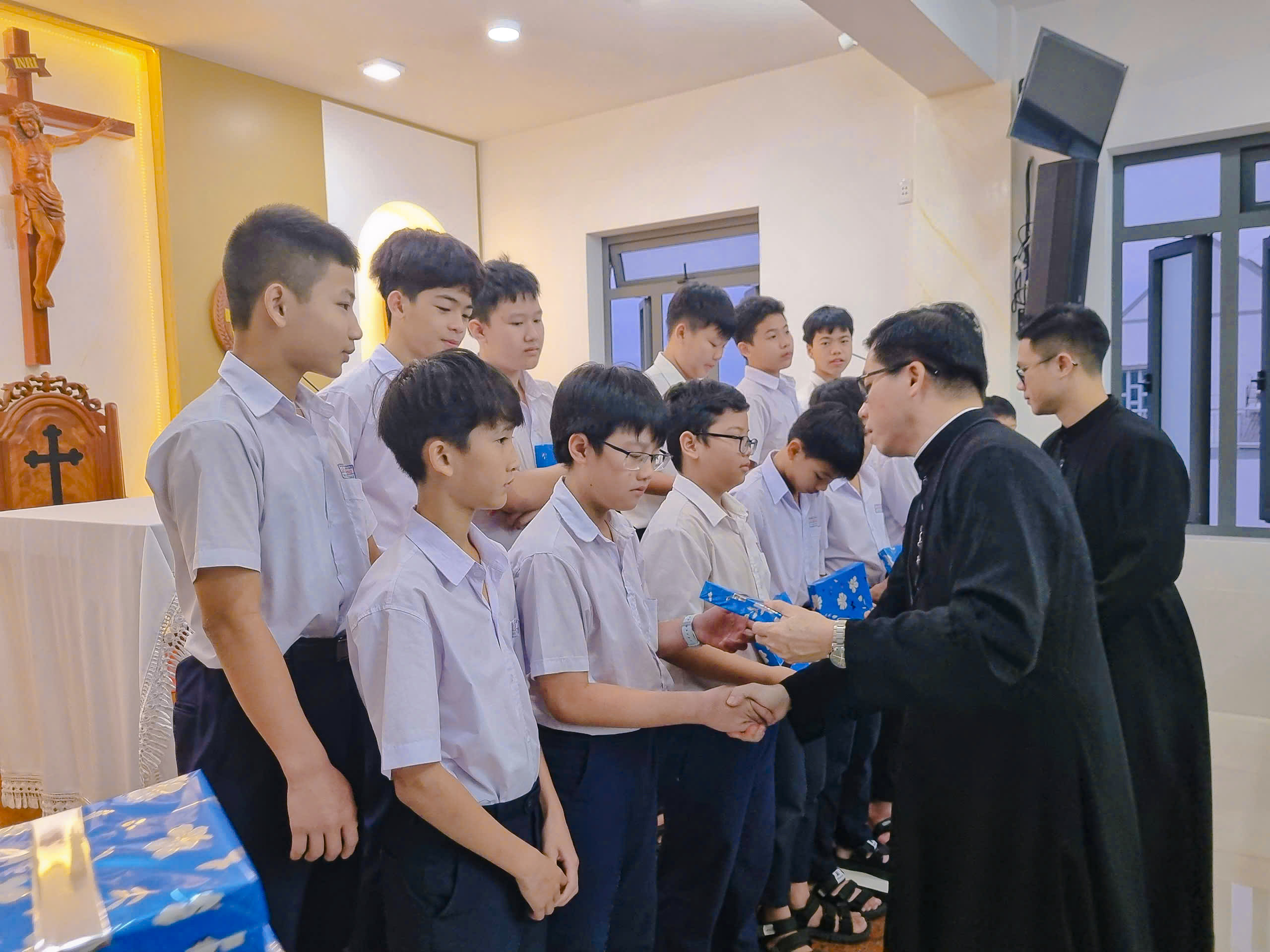 Và sau cùng là phần mà có lẽ các em lưu trú sinh rất mong đợi sau một kì học đầy cố gắng và quyết tâm, đó là phần vinh danh và khen thưởng các em có thành tích tốt trong học tập giáo lý và văn hóa. Cha Bề trên, Cha Giám đốc và Cha quản lý đã trao quà và phần thưởng cho các em. Những phần thưởng tuy giản dị, đơn sơ nhưng lại góp phần giúp các em lưu trú sinh có thêm động lực để cố gắng phấn đấu học tập và rèn luyện đạo đức mỗi ngày.