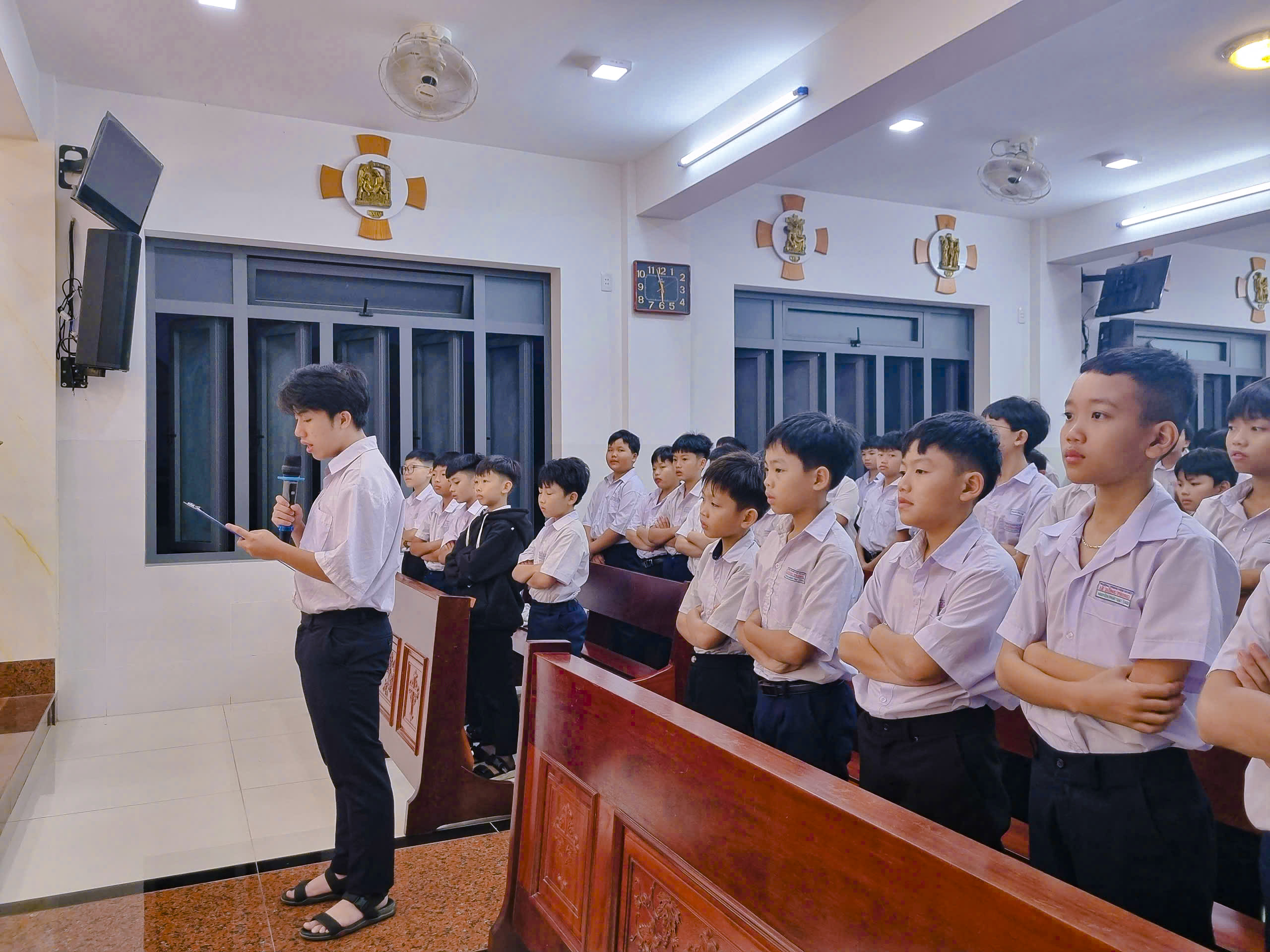 Dưới ánh sáng Lời Chúa theo Tin Mừng thánh Mác-cô (Mc 6,30-34), Cha Giám đốc Nhà Lưu trú đã nhắc nhở riêng các em lưu trú sinh: “Cuộc sống học tập hôm nay cũng rất dễ làm “chiếc ly tâm hồn” của các em bị đầy: đầy bài vở, đầy thi cử, đầy kỳ vọng, đầy mạng xã hội và điện thoại thông minh. Nhiều em bận rộn nhưng không bình an. Kết nối liên tục nhưng lại thiếu thinh lặng nội tâm. Học giỏi, làm nhiều, nhưng tâm hồn mệt mỏi và trống rỗng. Chính vì thế, lời mời gọi của Chúa Giêsu hôm nay dành cho các em một cách rất riêng: Hãy lánh riêng ra. Lánh riêng ra khỏi màn hình điện thoại. Lánh riêng ra khỏi những tiếng ồn không cần thiết. Lánh riêng ra để ở lại với Chúa – trong nhà nguyện, trong giờ cầu nguyện, trong thinh lặng của tâm hồn.”